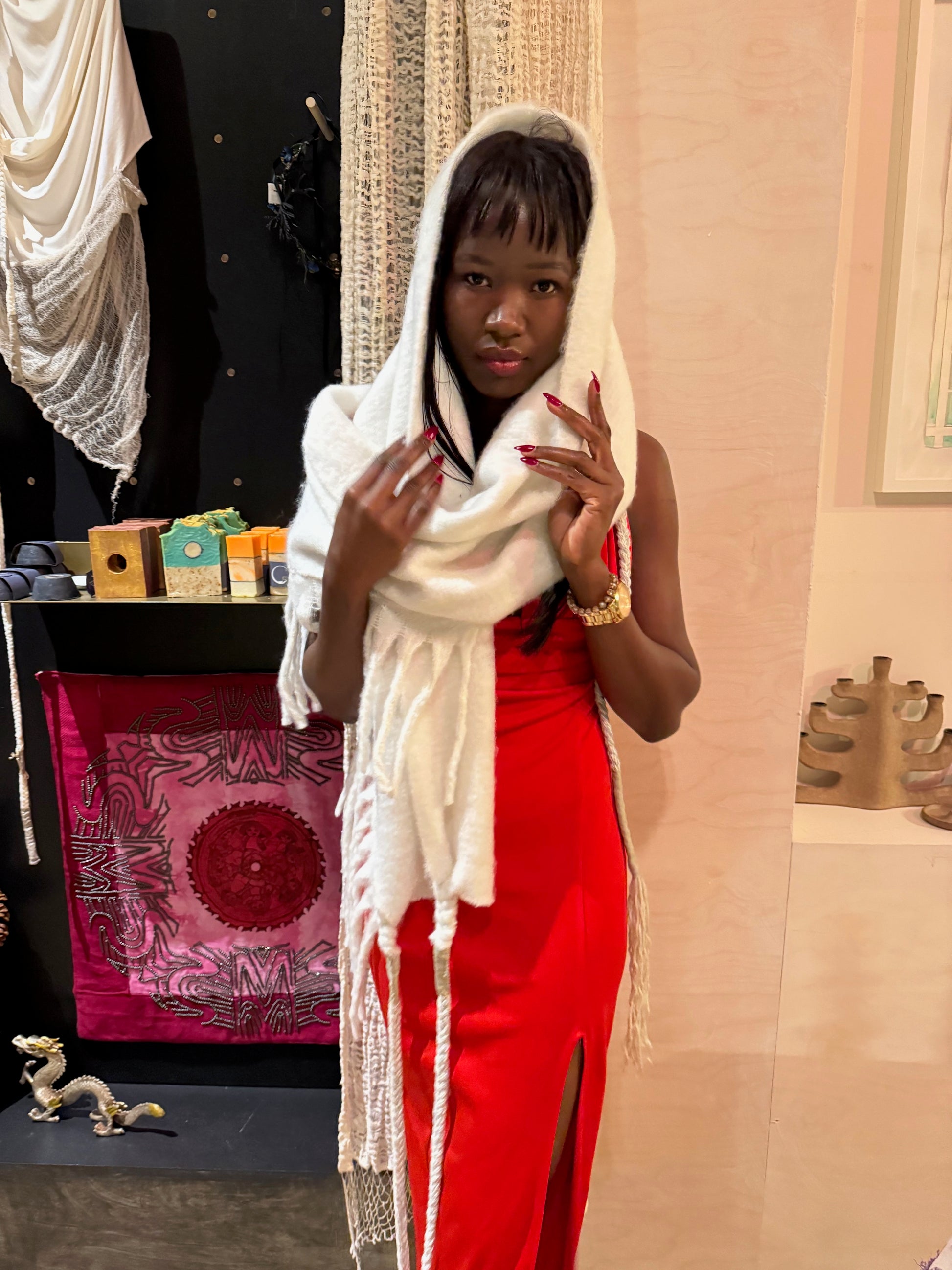 This beautiful desert shawl is a one of the kind creation. It can be worn as a headpiece, a belt, a scarf or a wrap.